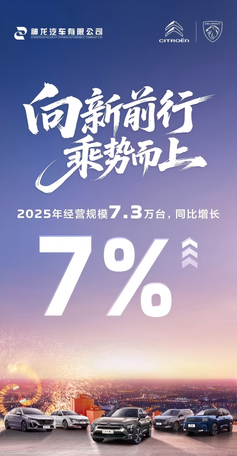 2025年,神龙汽车通过营销深化、品质坚守及协同赋能等系统化举措,推动经营实现稳健增长,同比增长7%,整体发展态势持续向好。不仅体现了企业的增长韧性,也为神龙汽车的复兴之路奠定了坚实基础。