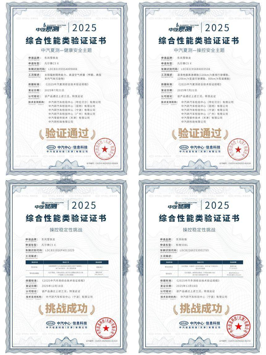产品层面,神龙汽车旗下车型更经受住了严苛考验。在中汽中心进行的夏季高温测试中,东风雪铁龙凡尔赛C5 X凭借在健康和操控安全层面的卓越表现,勇夺“健康与操控双安全”权威认证,令业界瞩目;年末,东风雪铁龙凡尔赛C5 X与东风标致508L又在极寒驾控安全验证中,凭借卓越的操控稳定性双双斩获“操控稳定性挑战”认证证书,展现了法系底盘技术应对极端环境的深厚功底。这些权威背书,不仅验证了神龙汽车产品在极端环境下的可靠性与安全性,更强化了“法式驾控”与“安全可靠”的核心品牌价值,成为赢得用户信赖的基石。