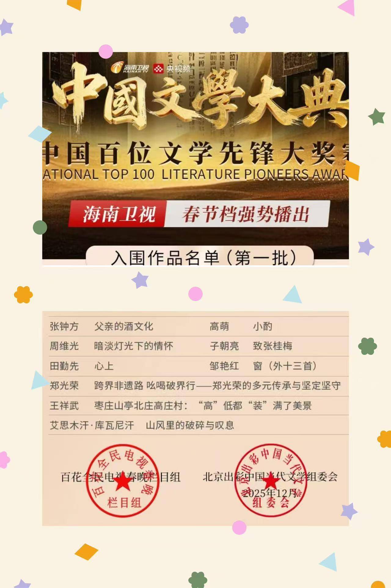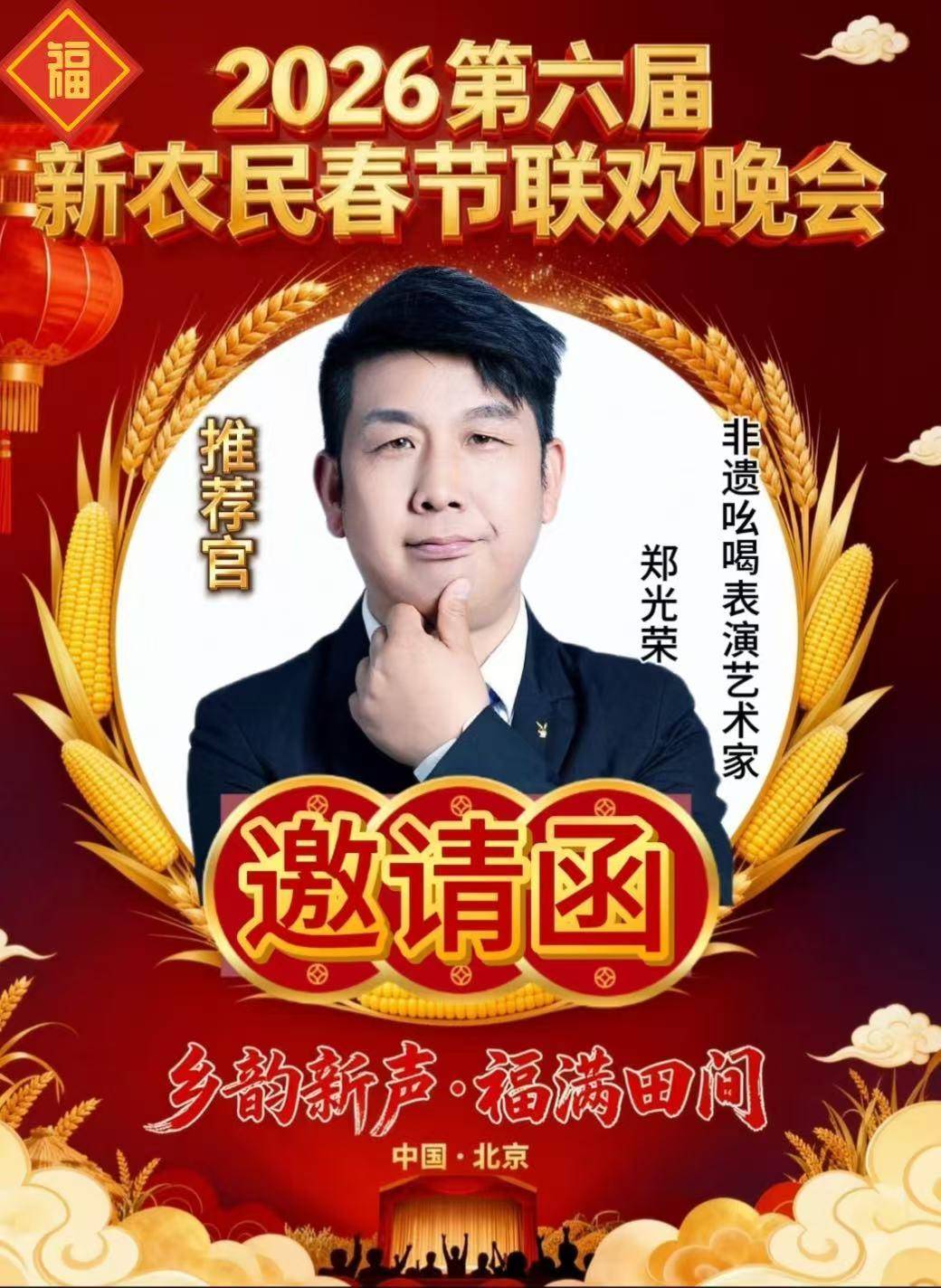 展望2026,郑光荣的艺术之路更加璀璨。据权威媒体报道,凭借2025年的卓越表现,他已收到多份重量级邀请函。这其中包括2026年央视春晚、2026百姓文艺春晚推荐官、2026年七彩星球《官方春晚》、2026春节联欢晚会万马奔腾中国年春晚推荐官、2026芳华自在锦绣中国非遗晚会,以及2026第九届萱花奖中华母亲(节)春节联欢晚会推荐官。