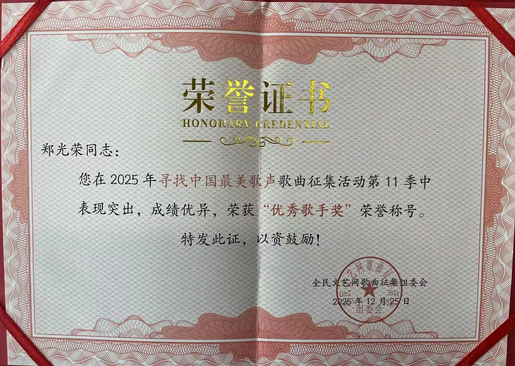 歌声耀中华,非遗续华章 —— 郑光荣荣膺2025“中国最美歌声”优秀歌手奖