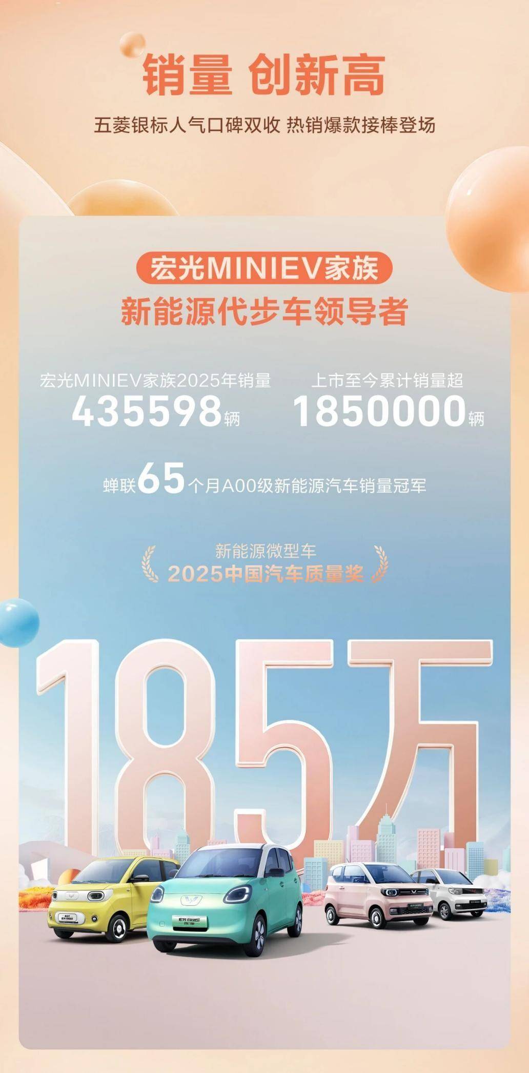 作为新能源代步车领导者的宏光MINIEV家族,2025年销量435598辆,上市至今累计销量突破185万辆,蝉联65个月A00级新能源汽车销量冠军。