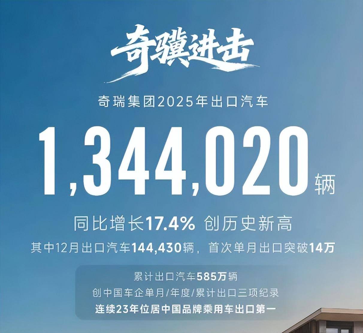 2025年,奇瑞汽车创下了中国品牌车企首家单月出口突破14万辆、首家年度出口超过134万辆、首家累计出口突破500万辆、首家连续8个月出口超10万等多项历史第一,出口市场覆盖全球120多个国家和地区,全球累计用户1853万。