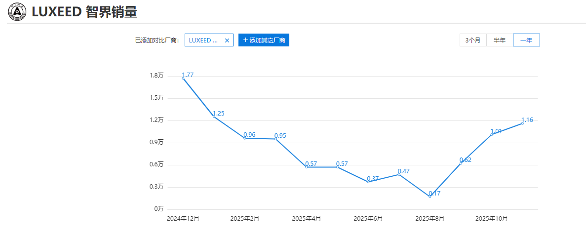 2025年智界品牌累计销量90493辆,同比增长56%,与其它的造车新势力相比,智界品牌的销量规模并不算大,不过它在2025年走出了一波V型反转,8月份时月销量跌破2000辆,但随着新款智界R7的上市,销量开始持续上扬,11月份新款智界R7一举冲入月销万辆俱乐部。