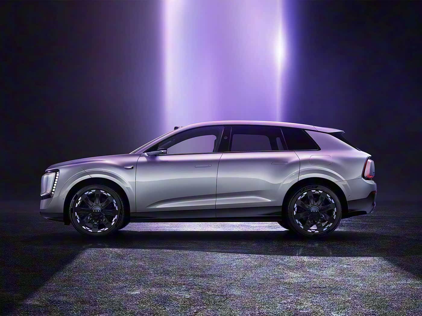 接着我们直接看车,新车的外观也是它的看点之一,新车定位中型SUV,采用纯电驱动,并且是一款5座车型。可以看到它的造型非常科幻,尤其是车头“回”型的灯带,搭配可发光LOGO,科技感直接拉满。另外,它的车头也没有过分下压,所以气势感同样不俗。车头的激光雷达,也就意味着新车会搭载高阶智驾。