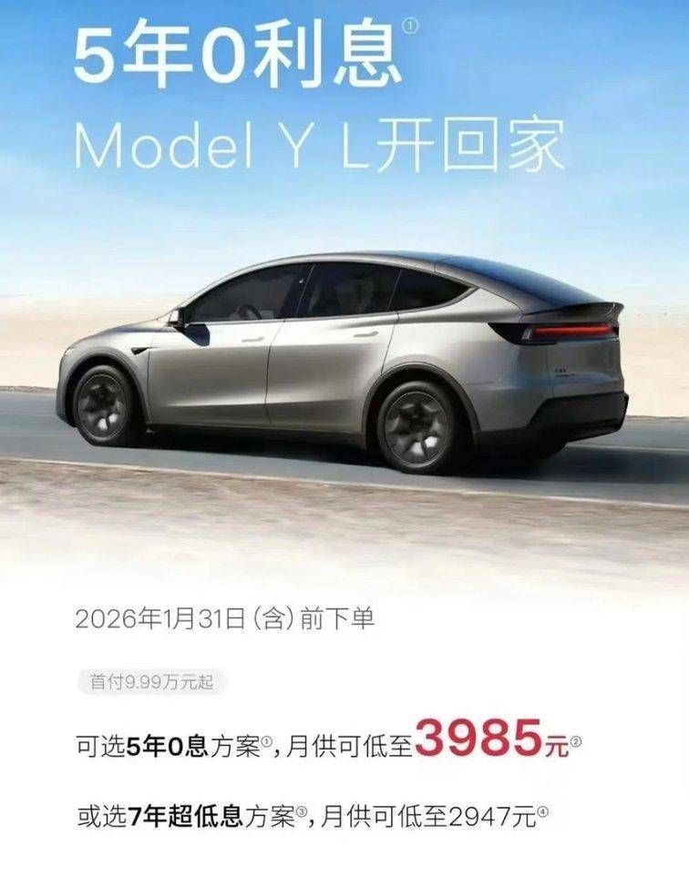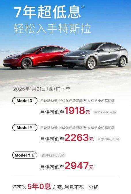 1月6日,特斯拉中国推出限时购车方案,覆盖Model 3、Model Y及Model Y L全系,2026年1月31日前下单有效。核心福利分两类:7年超低息(年化不足1%)与5年0息,直接免除利息负担。
