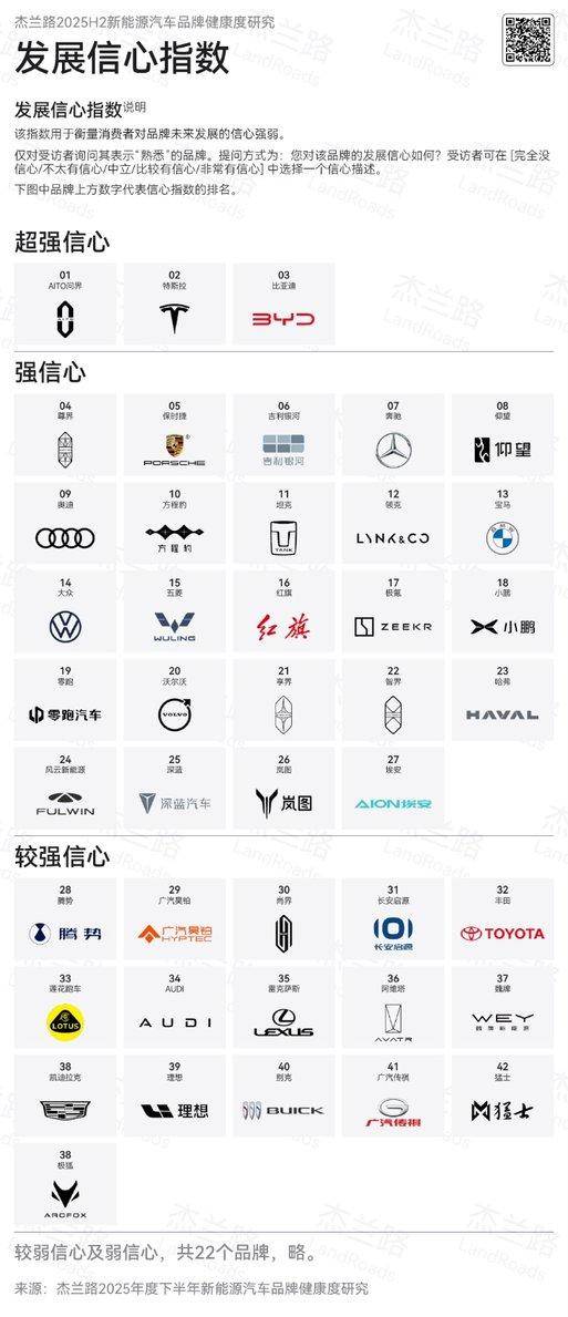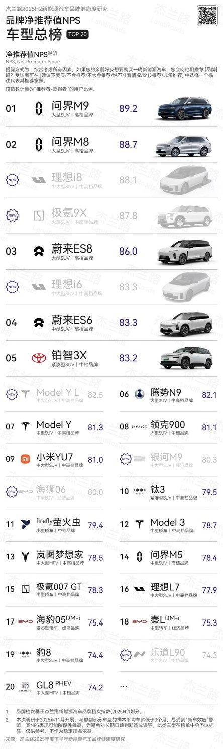 【有车开车资讯】近日,杰兰路咨询发布《2025下半年新能源汽车品牌健康研究报告》。报告显示,问界荣获品牌NPS(净推荐值)第一、品牌发展信心指数第一、30万元以上品牌百人青睐指数第一;问界旗下“双旗舰王牌”,再添口碑佳绩:全景智慧旗舰SUV问界M9荣获车型NPS (净推荐值) 第一,家庭智慧旗舰SUV问界M8首次参评即荣获NPS (净推荐值) 第二。这一系列亮眼成绩,无不彰显问界在高端新能源赛道的引领地位。