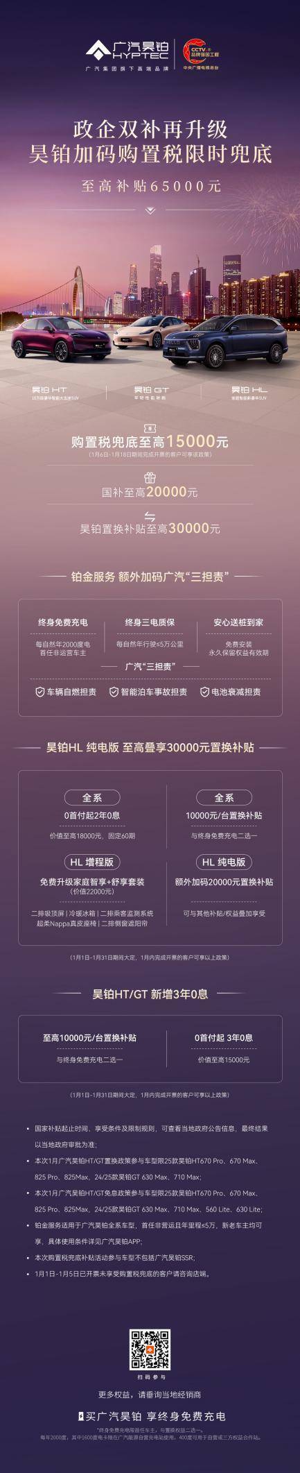 近日,广汽昊铂购车权益再加码,不仅以“政企双补”开启新年购车礼遇,更围绕用户全周期拥车体验持续升级服务,并再加码新能源购置税兜底政策,综合补贴最高可达65000元,为用户带来极具吸引力的购车良机。