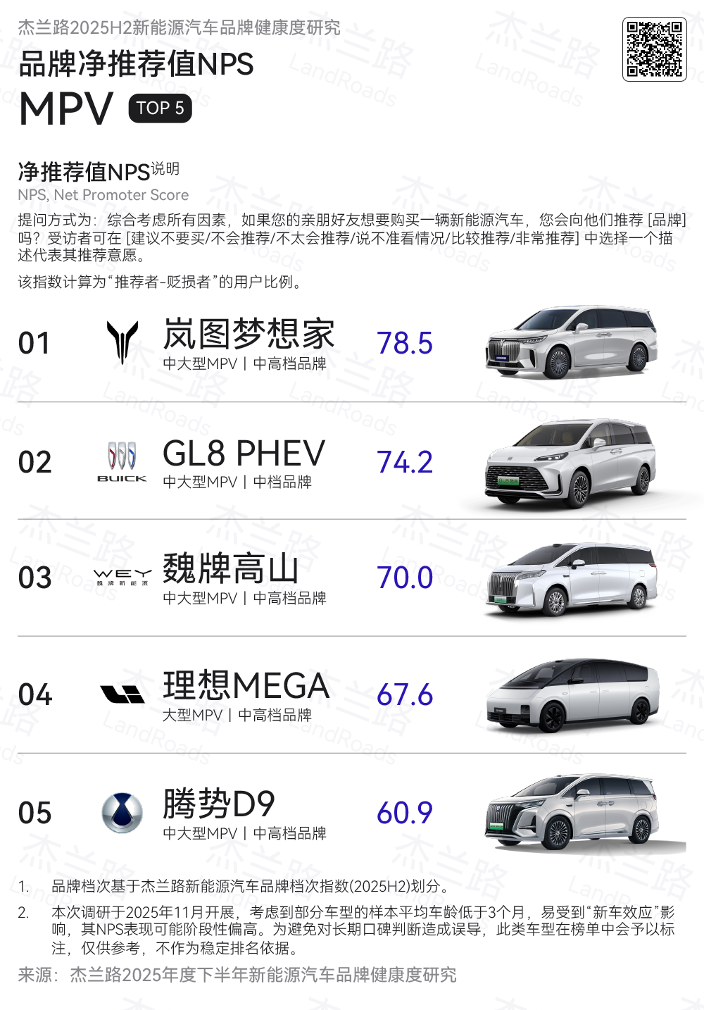1月6日,杰兰路发布《2025年度下半年新能源汽车品牌健康度研究(NPS篇)》,岚图梦想家以78.5分的净推荐值(NPS)高居新能源MPV榜首,与此同时,岚图梦想家领跑2025年下半年高端MPV市场销量榜,加冕“销量与用户净推荐值”双冠王。