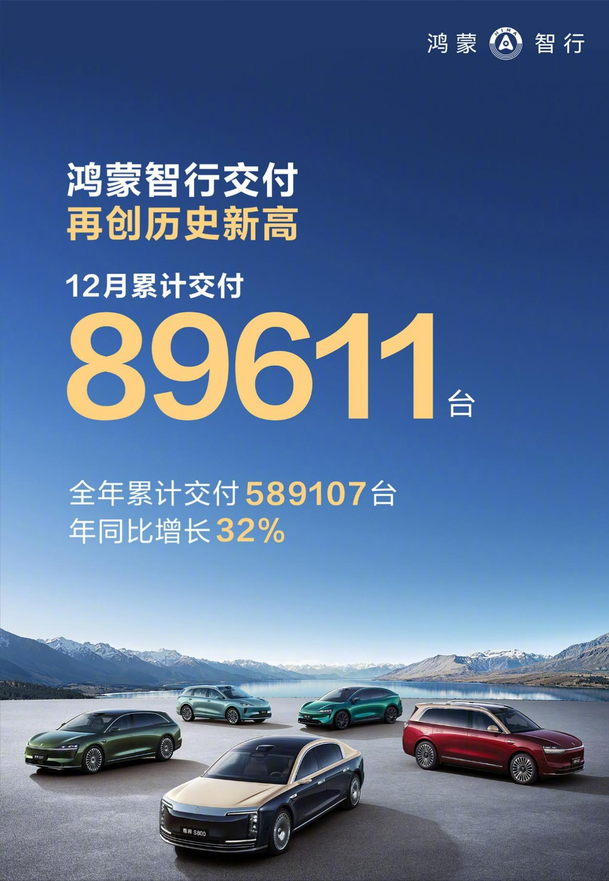 2026年伊始,鸿蒙智行交出了一份足以改写行业格局的成绩单:2025年全年累计交付589,107台,同比增长32%,12月单月交付更是达到89,611台,连续三个月刷新月度纪录。