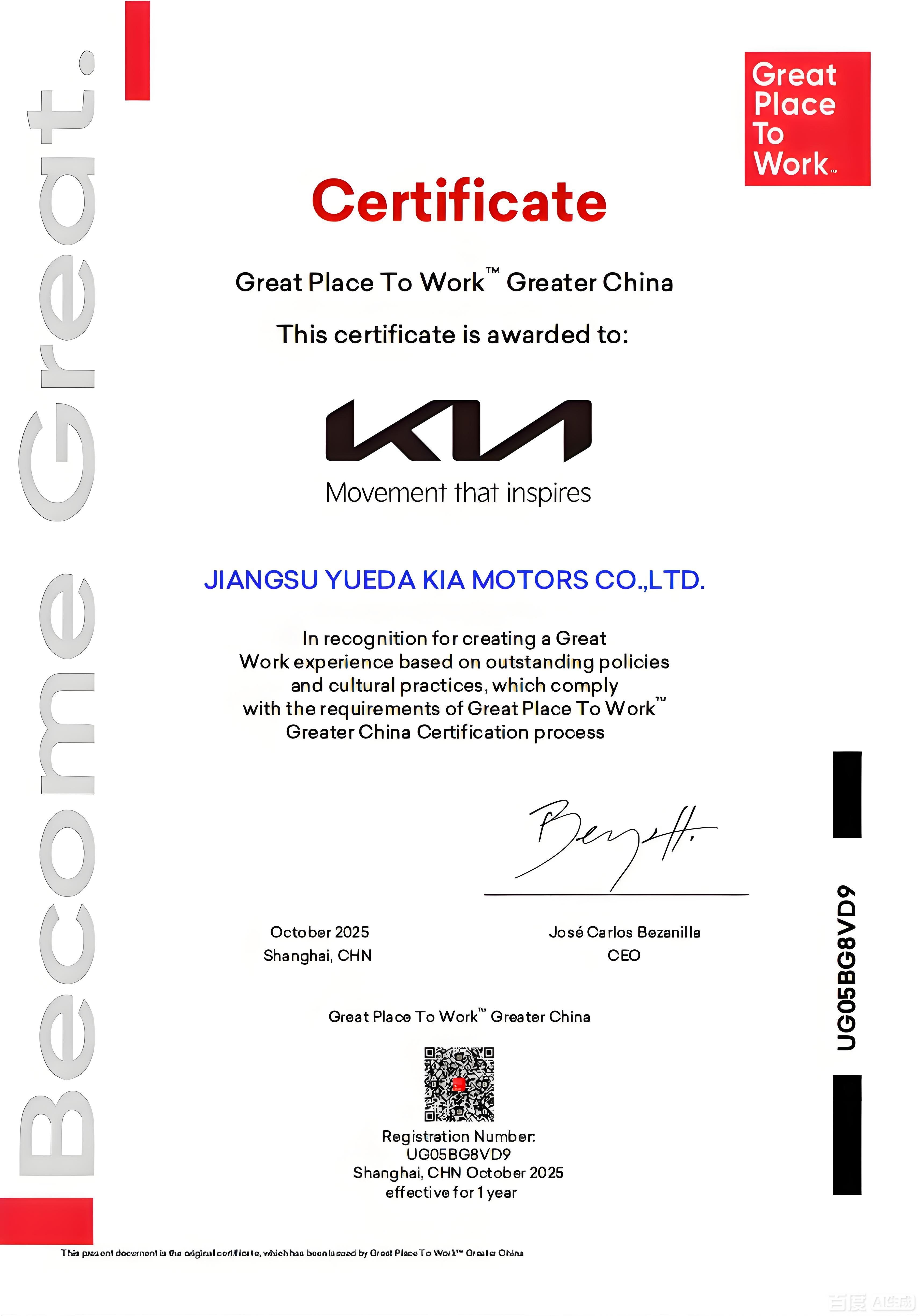 值得关注的是,在行业极度内卷的背景下,悦达起亚积极推进组织文化变革,构建了企业与员工和谐共生、双向赋能的职场生态,深入践行“以人为本”的长期主义发展理念。凭借在职场文化、人才梯队、员工关怀等领域的卓越实践,悦达起亚以93%的员工信任指数,高分荣获全球权威职场文化评估机构——Great Place To Work® (卓越职场研究所)颁发的“卓越职场”认证,成为2025年中国汽车行业唯一获得此项殊荣的汽车企业。