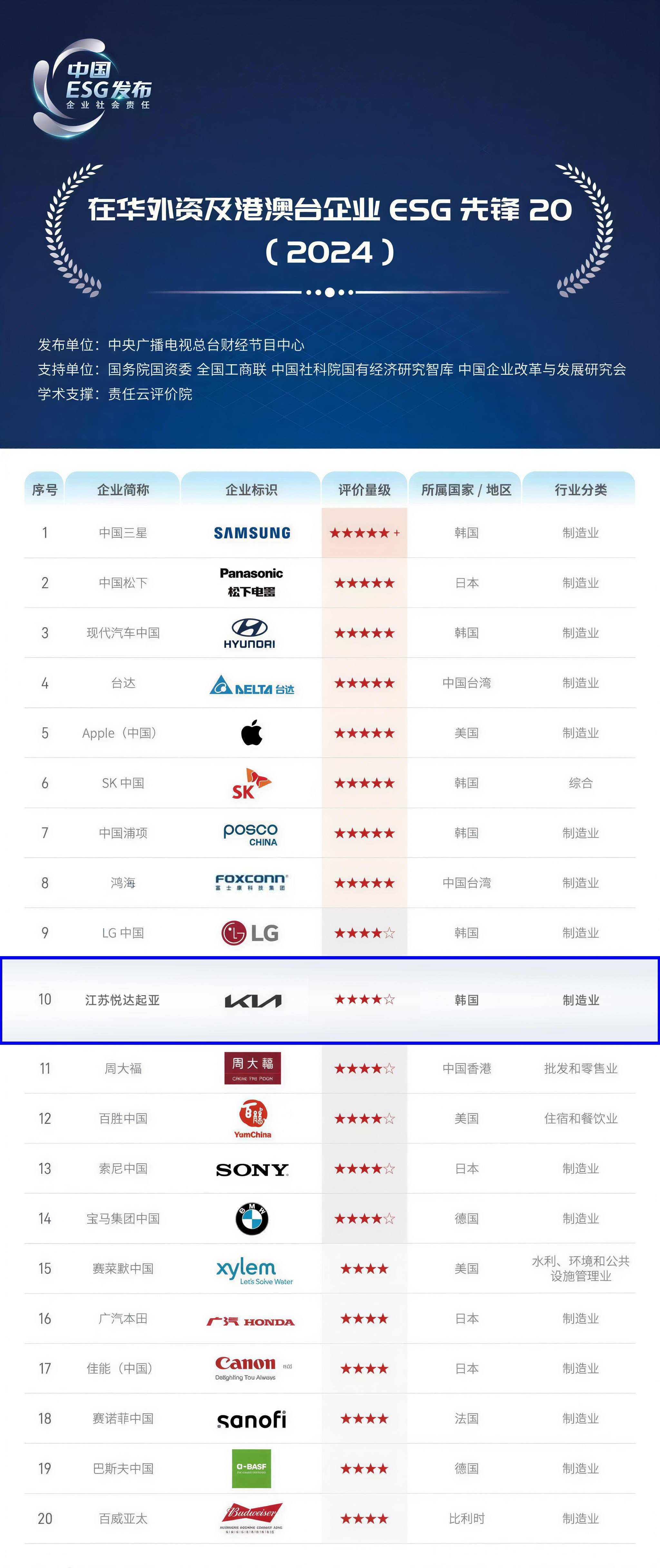 此外,江苏悦达起亚还连续2年入围中央广播电视总台“在华外资及港澳台企业ESG先锋”榜单前10,是榜单前10中唯一在华外资子公司企业。
