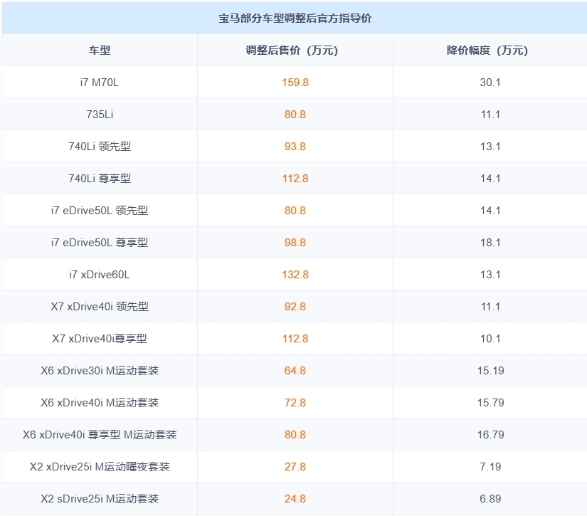 此次根据车型、配置不同降幅最低为900元,最高达到30.1万元,其中降幅最高的i7 M70L从189.9万元的官方指导价调至159.8万元,降幅高达30.1万元,诸如X6/7系/X7等豪车普遍都有超10万以上的降幅。