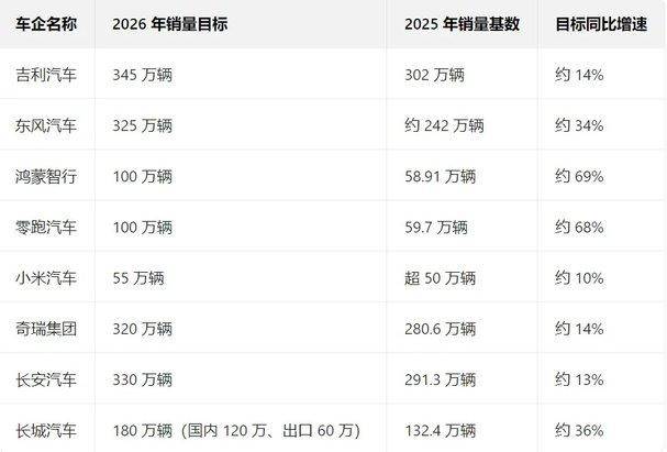 在国内车市进入 “高销量、低增长” 的新阶段,叠加新能源购置税优惠退坡、市场竞争转向价值战的背景下,这些目标究竟是立足实际的稳健规划,还是挑战行业天花板的激进冒险呢?我们一起来看看吧!
