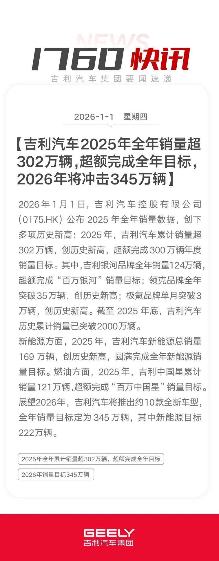 吉利的目标拆解清晰,新能源板块将承担222万辆销量,渗透率目标提升至 64.3%,贴合新能源仍是产业增长核心动力的趋势。