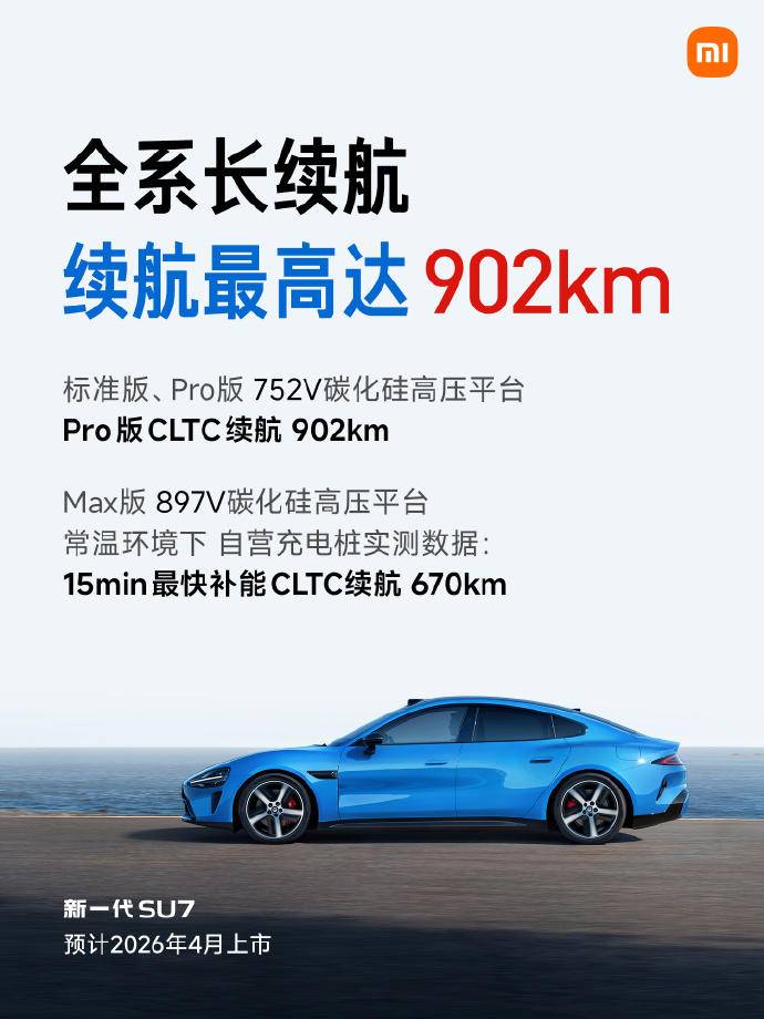 除了动力外,新款小米SU7的续航也进行了提升。其中Pro版的纯电续航里程提升到了902km;而标准版和Max版的纯电续航里程并未提及。