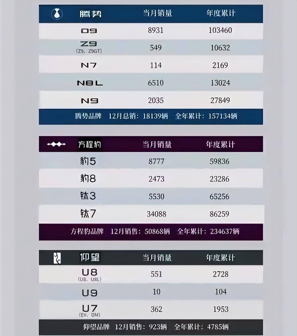 相较于王朝、海洋两大主流网络,由腾势、方程豹、仰望构成的“冲高矩阵”则直接决定着比亚迪在国内车市能攀升至何等高度。值得欣慰的是,这三大品牌2025年的终端表现同样可圈可点。