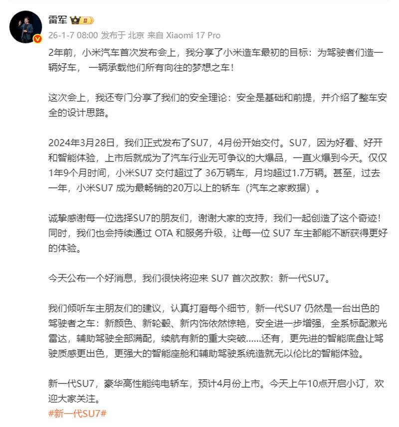《车矩阵》新车一手料:虽然新款小米的许多重要信息已经解密,大家也都知道它会在2026年内上市,但对于具体的一些信息还是没有详解。1月7日,雷军突然发文称:今天公布一个好消息,我们很快将迎来 SU7 首次改款:新一代SU7。