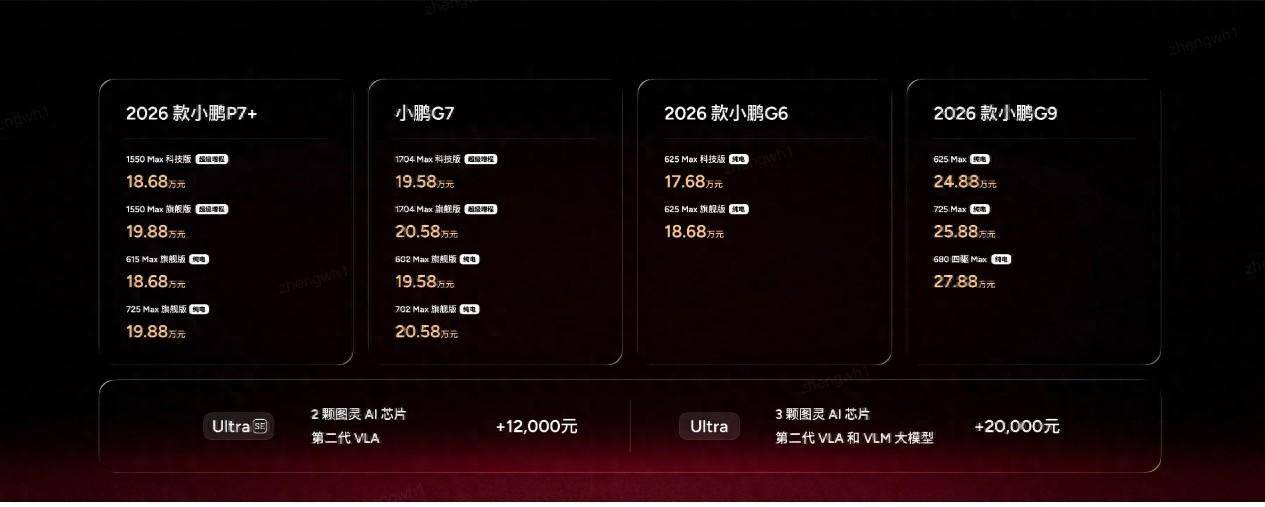 1月8日,在2026小鹏全球新品发布会上,小鹏汽车正式发布2026 款小鹏 P7+、小鹏 G7 超级增程、2026 款小鹏 G6、2026 款小鹏 G9。其中2026款小鹏P7+ 全球36国同步发布,新车有超级增程和纯电两种能源形式,超级增程有1550 Max 科技版和1550 Max 旗舰版,官方指导售价为18.68万元和19.88万元;纯电有615 Max旗舰版和725 Max 旗舰版,官方指导售价为18.68万元和19.88万元。2026款小鹏G7推出四个版本,超级增程1704 Max 科技版和1704 Max 旗舰版,官方指导售价为19.58万元和20.58万元;纯电602 Max 旗舰版和702 Max 旗舰版,官方指导售价为19.58万元和20.58万元。2026 款小鹏 G6推出纯电625 Max 科技版和625 Max 旗舰版,官方指导售价为17.68万元和18.68万元。2026 款小鹏 G9推出纯电625Max、725 Max和680 四驱Max版,官方指导售价为24.88万元、25.88万元和27.88万元。