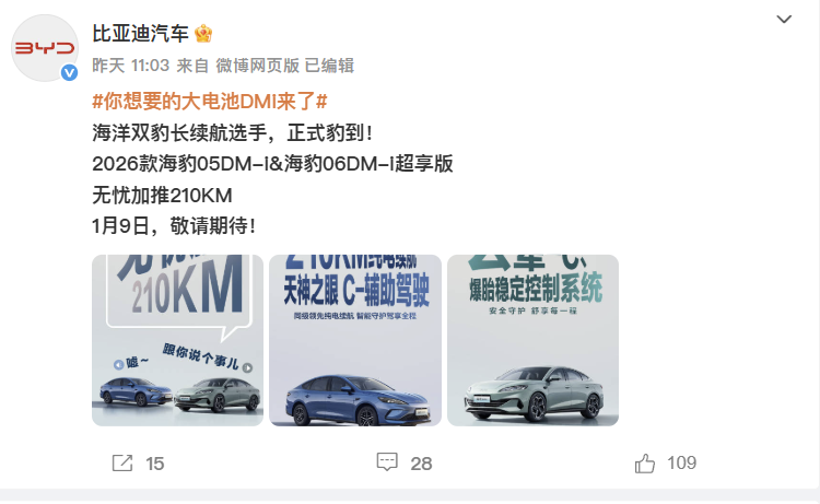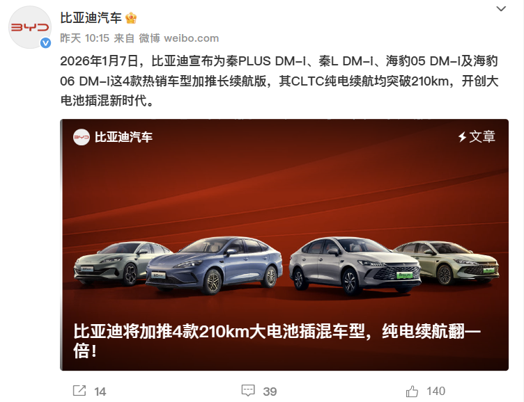对北方车主来说,冬天开插混车就像一场“续航大考”:零下十几度的低温里,电池活性骤降,标称120km的纯电续航实际能跑80km就不错,开暖风更是耗电如流水,一天一充成了常态,原本的“可油可电”反倒成了“被迫用油”。但2026年开年,比亚迪的一则官宣给北方车主送来了暖阳——为秦PLUS DM-i、秦L DM-i、海豹05 DM-i及海豹06 DM-i四款热销车型,加推纯电续航突破210km的长续航版本,用实打实的电力加码,成为北方冬天的混动“救星”。