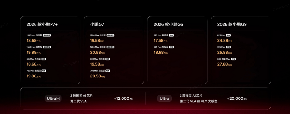 其中,2026款小鹏P7+纯电版与增程版同价,价格18.68-19.88万元;小鹏G7纯电版与增程版同价,价格19.58-20.58万元;同时2026款小鹏G9/G6迎来改款,整体价格17.68万元起。值得注意的是,据小鹏汽车CEO何小鹏透露:“今年小鹏还会推出4款全新的SUV,而且是面向全球的”。不难看出,2026年将是小鹏汽车的产品大年。