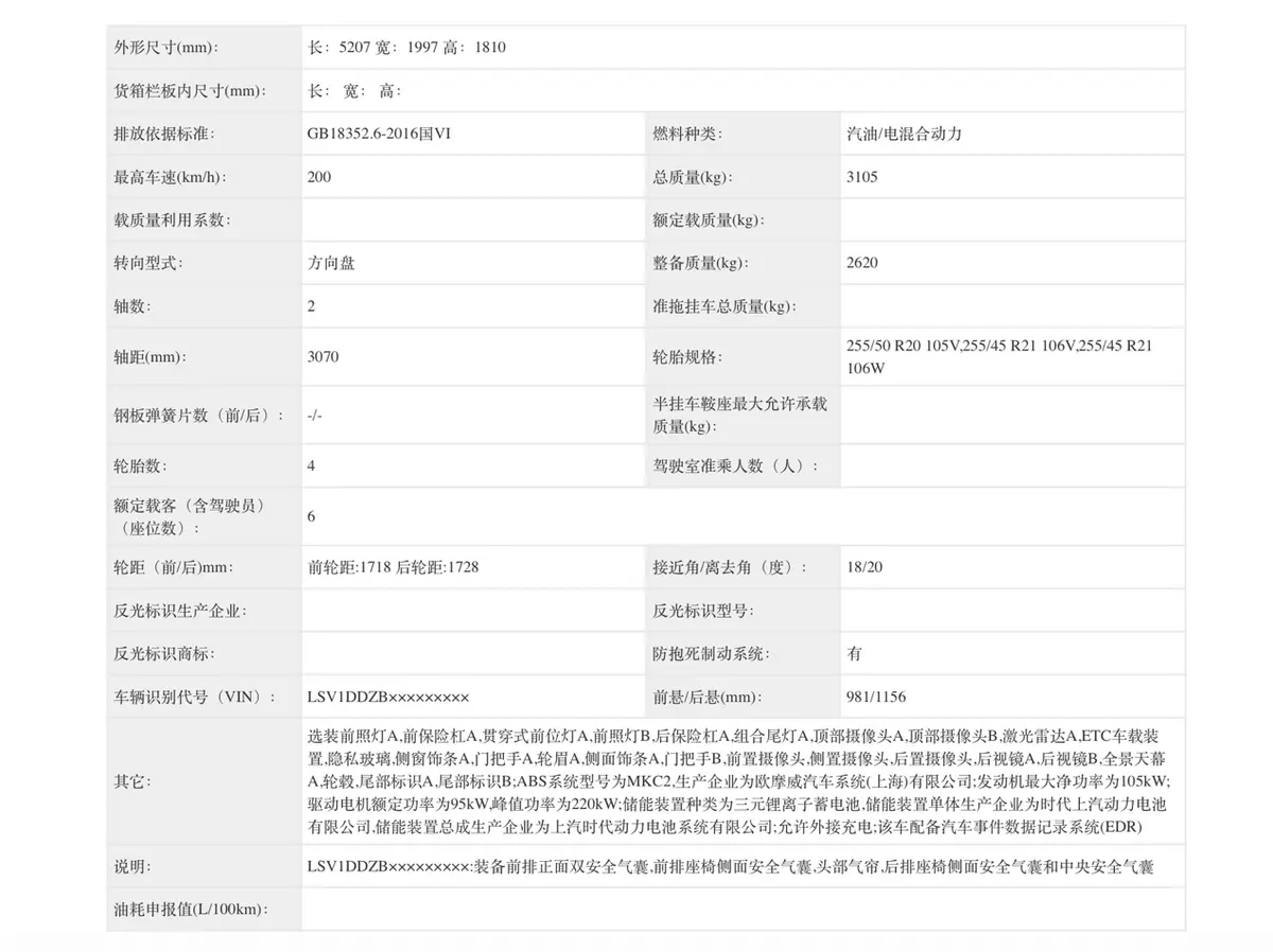新车长宽高分别为5207/1997/1810mm ,轴距为3070mm。