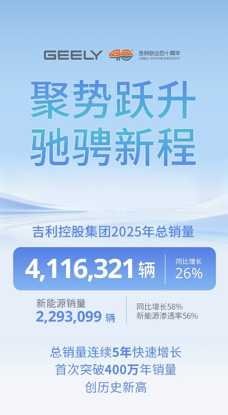 2025年中国汽车产业转型纵深推进的关键期,吉利控股集团交出亮眼成绩单:全年全球总销量达411.63万辆,同比增长26%,实现连续五年快速增长的同时,首次突破400万辆大关创历史新高。其中新能源车型销量劲增58%,达229.31万辆,渗透率攀升至56%,成为驱动集团增长的核心动力,彰显中国汽车品牌在全球新能源赛道的领先实力。