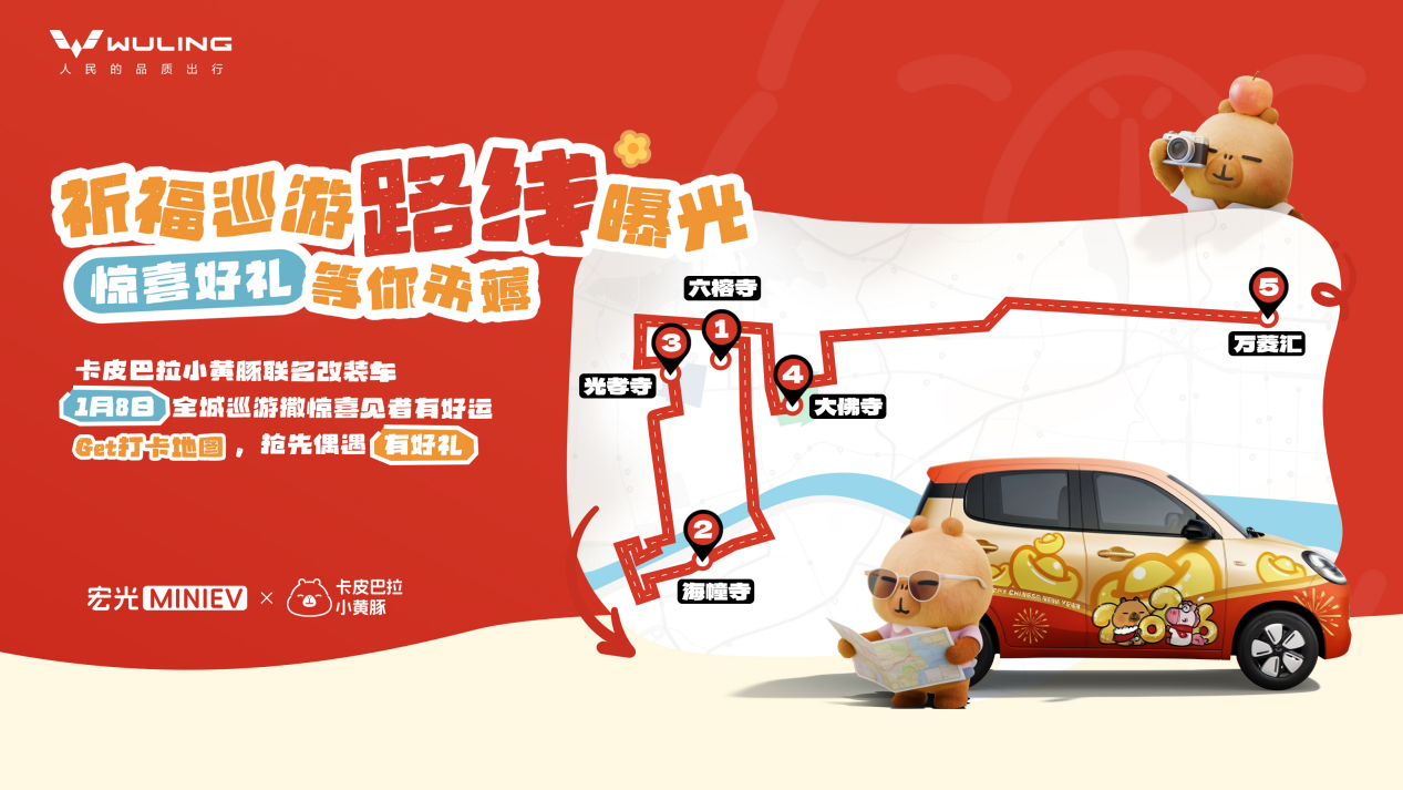 本次联名活动以“开宏光MINIEV,马上有好运”为主题,于1月8日在广州正式启幕,为广大用户送上新年好运势!数辆宏光 MINIEV“好运锦豚车”化身“好运派发官”全城巡游,在光孝寺、海幢寺等多个广州热门打卡点,为大家派送惊喜好礼!