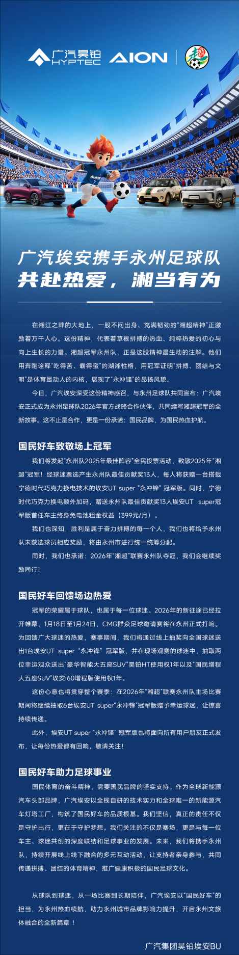 1月9日,广汽埃安与永州足球队共同宣布达成重要合作。广汽埃安正式成为永州足球队官方战略合作伙伴,双方将携手全力征战2026年湖南省足球联赛。