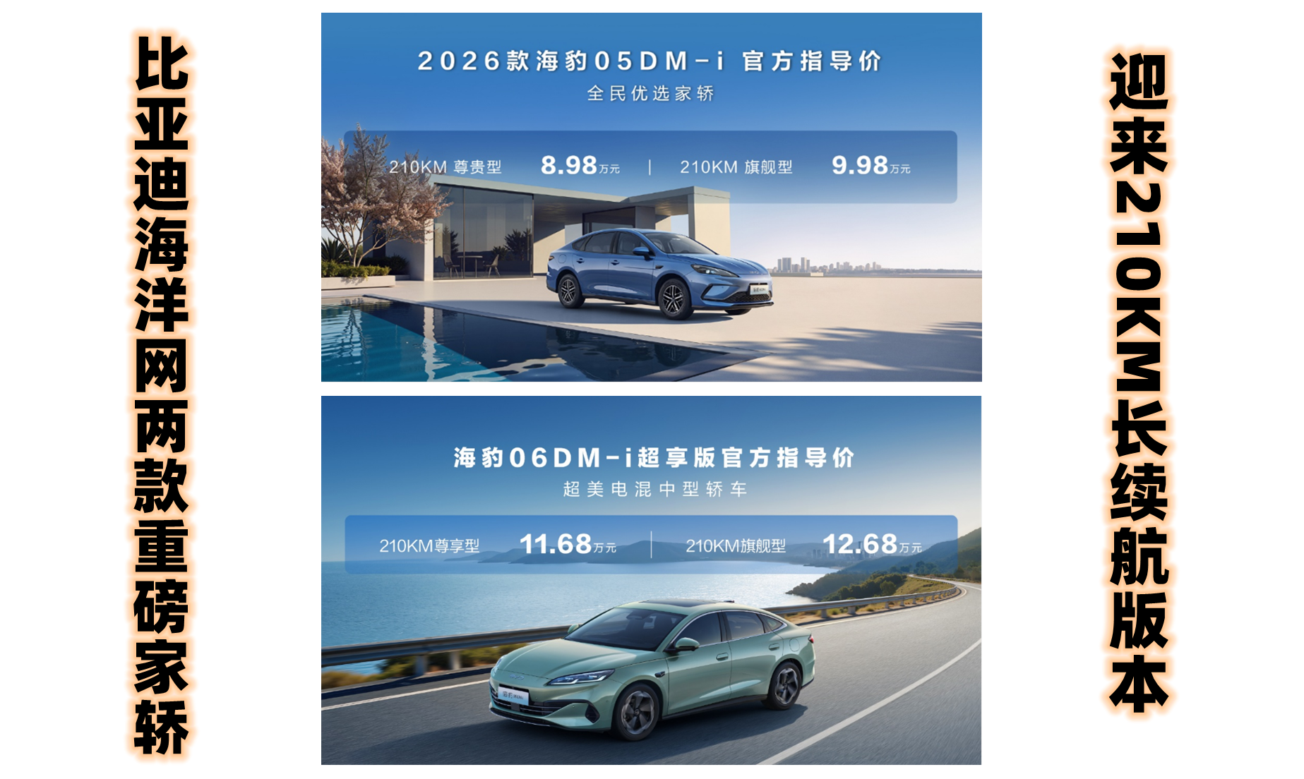 1月9日,比亚迪海洋网旗下两款重磅家轿——2026款海豹05DM-i与海豹06DM-i超享版,正式宣布分别加推两款纯电续航高达210km的全新车型。其中,2026款海豹05DM-i加推210KM尊贵型、210KM旗舰型,官方售价8.98-9.98万元;海豹06DM-i超享版加推210KM尊享型、210KM旗舰型,官方售价11.68-12.68万元。即日起,用户可享0首付或0利息、置换补贴、全系2年免费车机流量(5GB/月)、非营运车辆三电系统终身保修(首任车主),整车包修期6年或15万公里等多重上市购车礼遇。