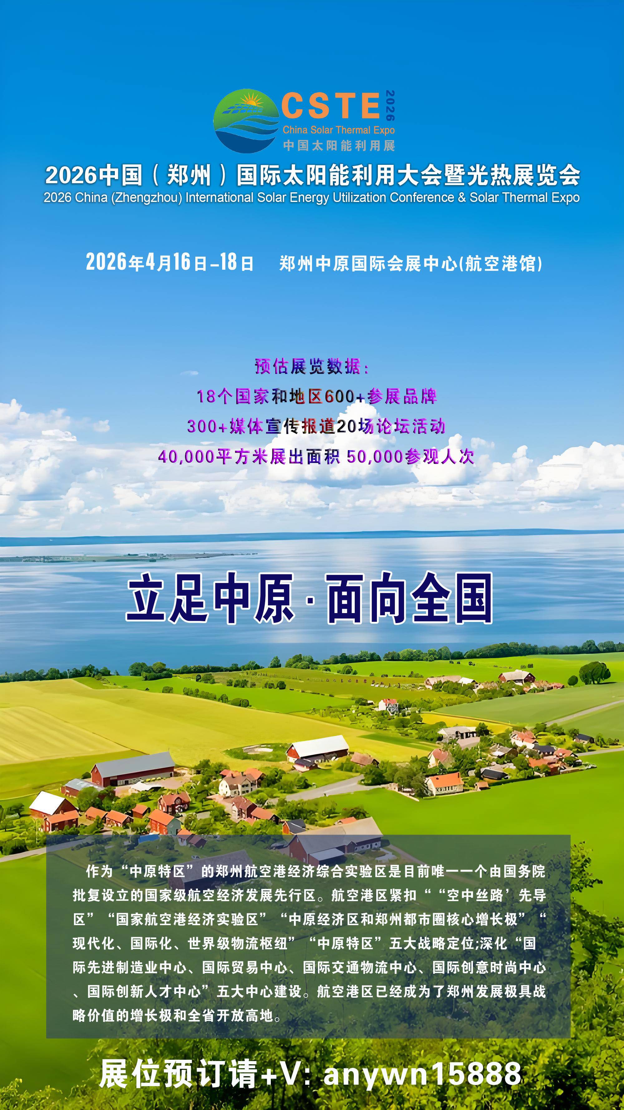 为加速产业协同发展,2026中国(郑州)国际太阳能利用大会暨光热展览会将于4月16日-18日在郑州航空港中原国际会展中心举行。本届展会由爱博国际展览联合河南省电器工业协会主办,与第六届中国(郑州)国际太阳能光伏及储能产业展览会协同举办,规划4个展厅、展览面积达40,000平方米,预计吸引600家品牌展商和超50,000名专业观众。展会将集中展示光热发电核心技术装备,包括聚光系统、吸热器、储热装置、换热系统等全产业链创新成果,并设立“光热+光伏+储能”多能互补专题展区。同期将举办20余场高端论坛,邀请政府部门、电网企业、设计院及龙头企业共同探讨光热参与电力市场交易、混合电站设计优化等前沿议题。