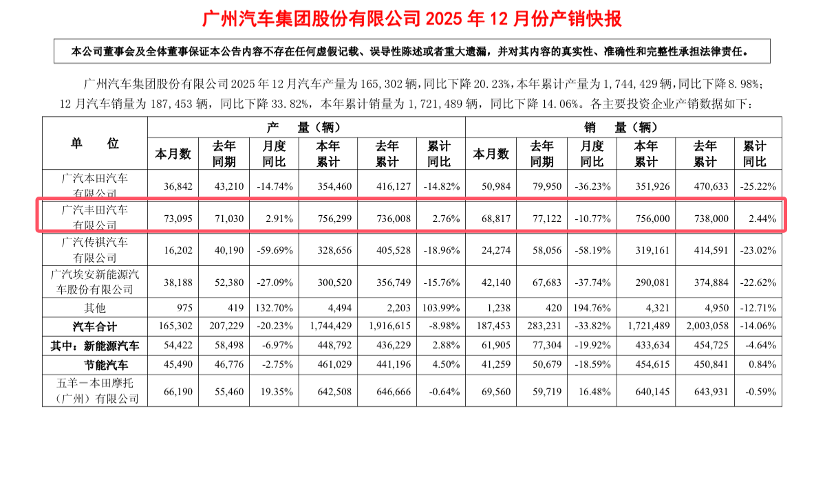 新年伊始,广汽集团正式发布了2025年产销快报。广汽丰田在这份成绩单中呈现出一幅微妙的图景:全年累计销量756,000辆,同比增长2.44%,成为集团内少数实现正增长的板块。但在这份全年喜讯背后,却隐藏着一个令人关注的转折:2025年12月单月,广汽丰田销量为68,817辆,同比下滑10.77%。