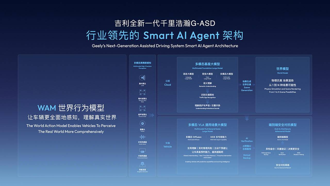 利用完整应用WAM模型,并采用Smart AI Agent架构。千里浩瀚G-ASD云端多模态大模型与世界模型参数达千亿级别,在通用大模型加持下,显著提升环境认知与推理能力。模型范式也升级为生成式,融入国宾级司机驾驶数据,追求更类人、安全的驾驶风格。