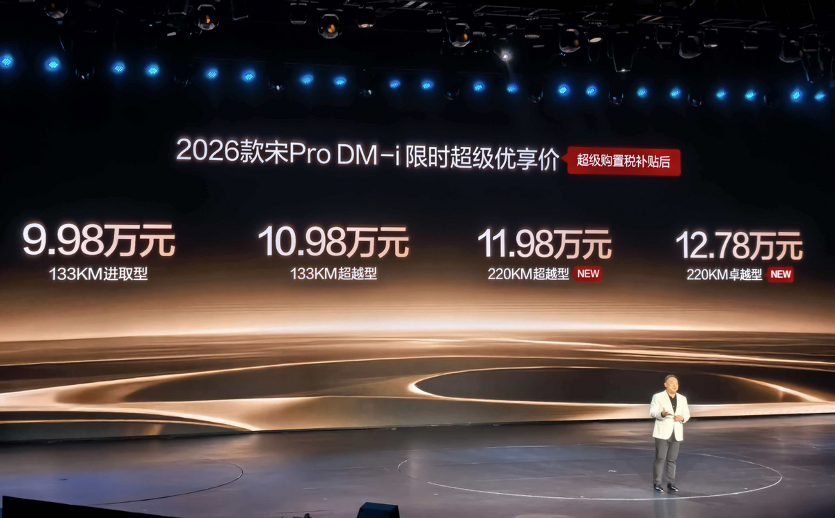 1月10日,比亚迪正式宣布2026款宋Pro DM-i上新220km长续航版本,全系限时超级优享价9.98万元-12.78万元。