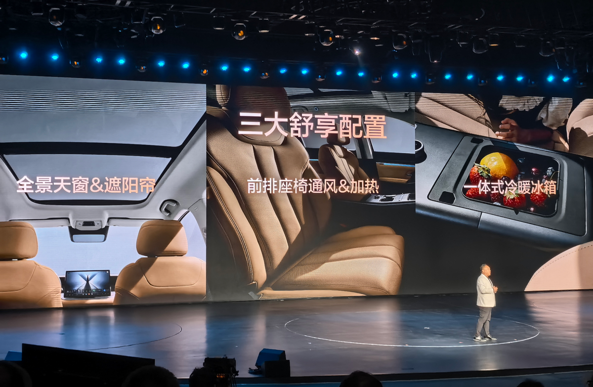 座舱内的智能化体验丰富,新增的一体式智能冷暖冰箱、前排座椅通风加热、感触式广角全景天窗、31 色环抱式情景氛围灯,结合15.6寸中控Pad与沉浸式音乐厅级音响,共同营造出高品质的舒适氛围。外还整车支持OTA远程升级,确保这些智能舒适体验常用常新。