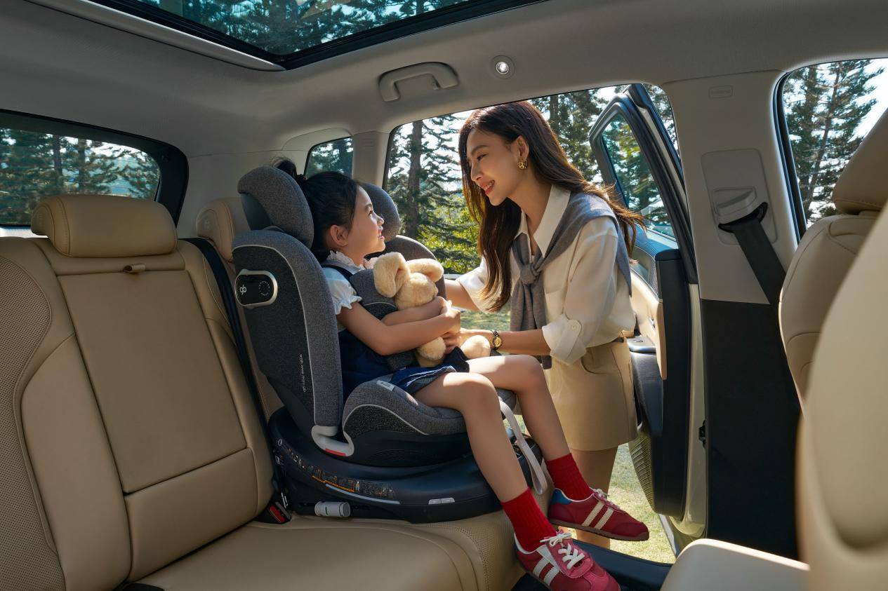 如果说长续航是基础保障,那么贴合家庭场景的配置升级,让这款车的实用性进一步提升。新车没有追求华而不实的功能,而是聚焦家庭出行的实际痛点:与好孩子合作的智能儿童座椅支持车机联动和自动旋转,让抱娃上车变得更加便捷;前排座椅通风加热、冷暖冰箱、感触式全景天窗等配置,能兼顾老人、孩子的乘坐舒适需求,让长途旅途更惬意。