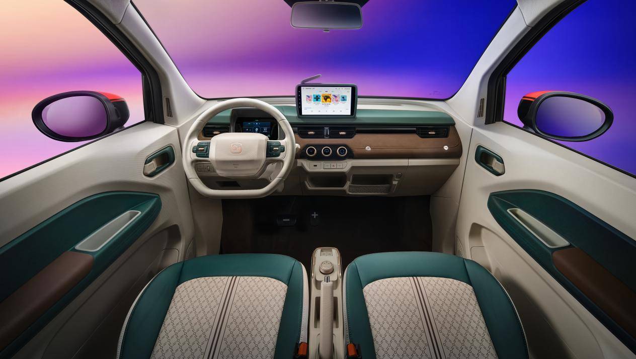 内饰质感的提升是全新冰淇淋的一大亮点。麂皮绒质感皮料包覆的软饰触感亲肤,IP装饰件采用纯铝氧化工艺,质感可越级对标10万元级别车型。同级唯一的皮质多功能方向盘、主驾带补光灯化妆镜,细节之处彰显精致;9英寸智能触控大屏内置导航、语音交互等功能,支持手机互联,满足年轻人的智能娱乐需求;20处储物空间+10L复古小书包的组合,让日常杂物收纳变得轻松便捷。