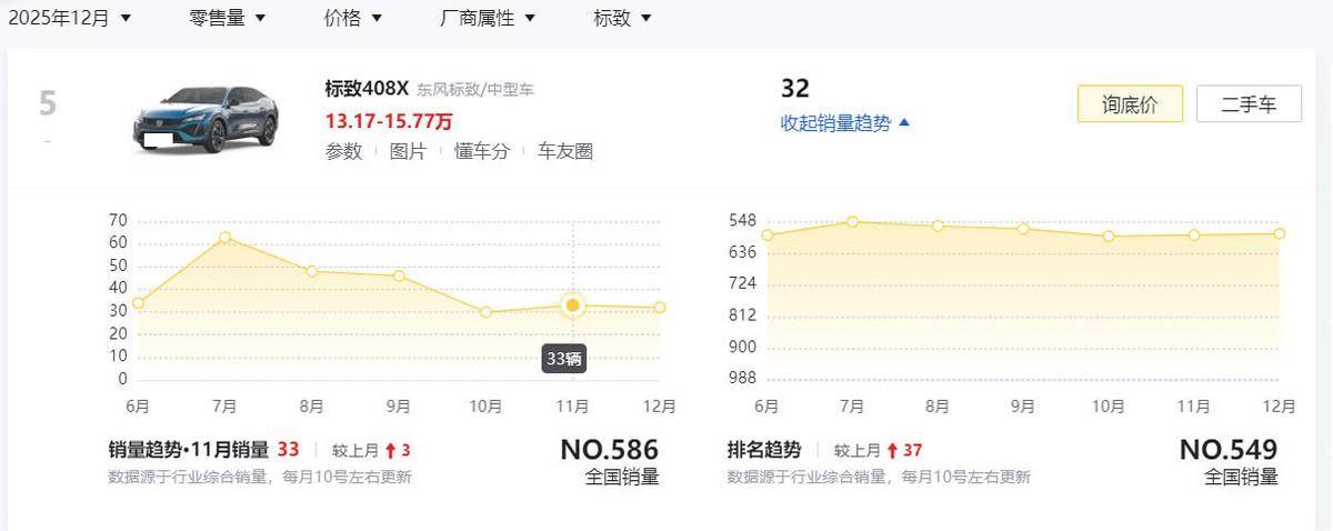 要知道,目前国内市场在售的东风标致408X车型,其最新的12月份销量数据可是还只有32辆新车,排名也属于是东风标致家族车系里面最垫底的存在。因此,倘若国产版的标致408X能按照这刚曝光的新款标致408模样去投产,没准是能提振一下现有的销量,你们觉得呢?评论区里留言说说看。(文/优视汽车 大卓 )