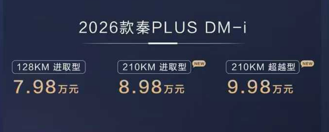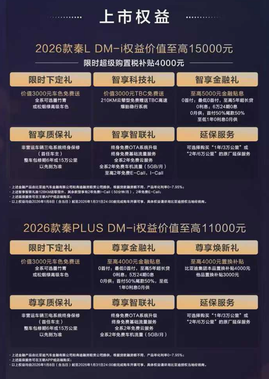 新车售价8.98-12.28万元。其中,2026款秦L DM-i 210KM长续航版限时超级优享价11.28-12.28万元,2026款秦PLUS DM-i 210KM长续航版售价8.98-9.98万元。同时,两款车型均带来了丰厚的上市权益礼。