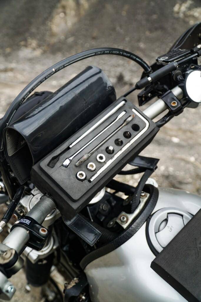 令人最感兴趣的小细节,莫过于手把上的 XGrip Mc Gyva 工具包护垫,这简直是天才的设计,直接把维修工具整合在手把中央,既美观又能随时备战。