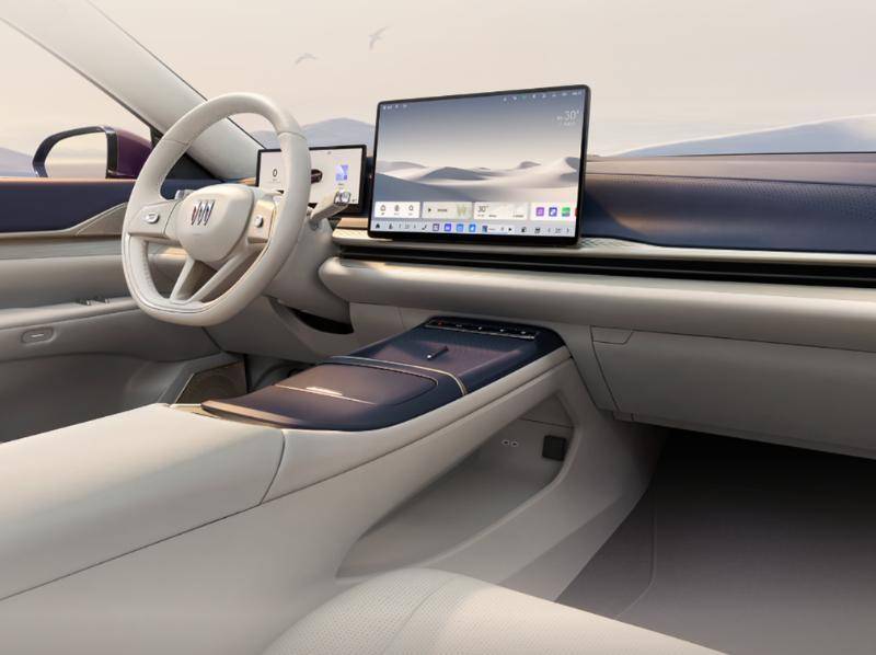 内饰部分,虽然上汽通用官方还未透露相关信息,但通过至境L7也可以大致推测出至境E7的座舱设计布局。别克至境E7预计采用和至境L7相同的内饰设计,简洁风格的座舱会强调居家氛围感。新车会配备全液晶仪表屏+悬浮式中控大屏+全景AR-HUD抬头显示系统;中控鞍座为双层设计,以提升储物能力。
