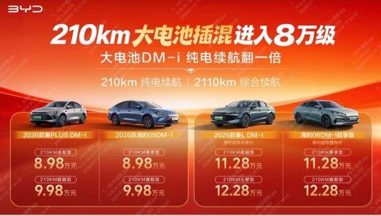 更让人惊喜的是价格。作为A级家轿代表,2026款秦PLUS DM-i 和 海豹05 DM-i 起售价仅为 8.98万元,顶配也不过 9.98万元。要知道,过去这个价位的混动车纯电续航大多只有50-120公里,如今直接翻倍,还配上最新技术,性价比堪称"降维打击"。而定位稍高的秦L DM-i 和 海豹06 DM-i(中型轿车),官方指导价为11.68万–12.68万元,限时优惠后低至 11.28万元起,空间更大、配置更高,却依然保持亲民价格,直接刷新了中型混动家轿的价值标杆。