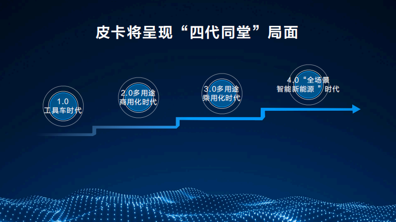 从1996年第一辆迪尔皮卡下线以来,以可靠的品质、务实的价格,成为老百姓创富的伙伴,引领皮卡1.0工具车时代;到2006年推出“皮实耐用”的风骏皮卡,历经20年市场淬炼使其成为全球累计销量突破200万辆的“民生第一车”,领跑皮卡2.0多用途商用化时代;再到2019年中国首个全球化皮卡品牌——长城炮诞生,开创乘用化皮卡新品类,搭载多连杆后悬架、采埃孚8AT、L2级驾驶辅助系统、智能网联等乘用车核心技术,引领中国皮卡进入3.0多用途乘用化时代,赢得近80万的用户信赖;以及2025年山海炮Hi4-T以全球首款越野混动皮卡之姿,凭借“要劲儿有劲儿、要电有电、要省能省”的超级混动架构将皮卡多用途和新能源完美融合,引领皮卡进入“4.0全场景智能新能源时代”。