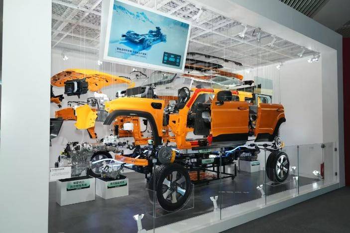 首先展现的是重新定义安全基准的车身架构。裸露的非承载车身,清晰展现其军工传承的“两纵八横”一体式高强度大梁。而更引人注目的,是全球新能源越野车中独有的内嵌式金属防滚架。它不再是藏在车壳里的安全配置,而是成为了一项可以直接审视的安全承诺。参观者能清楚地看到,这个可以承受10吨重压的坚固结构,是如何巧妙地与车身精密融合,在提供顶级防护的同时,又完整保留了车内空间。