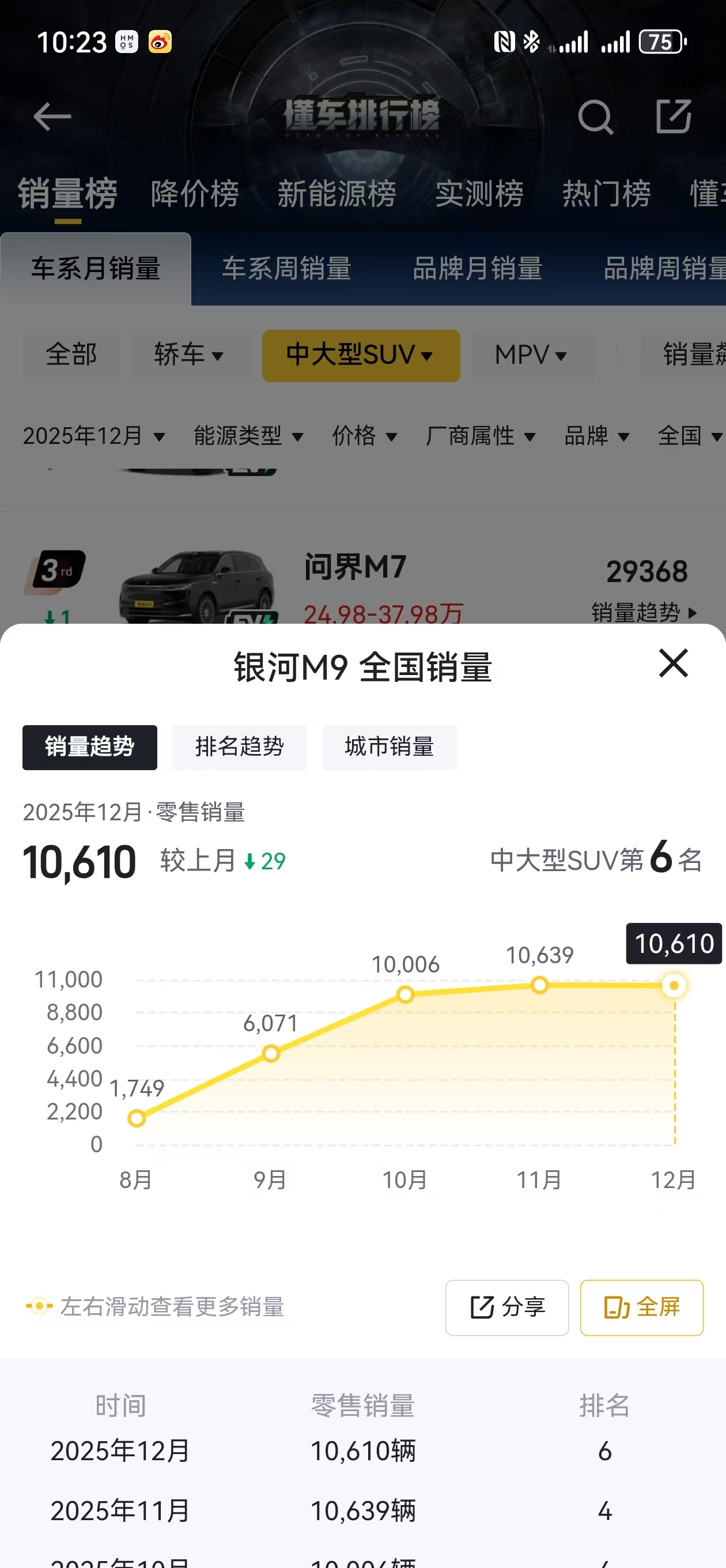 近日,AI科技大六座旗舰SUV——吉利银河M9公布最新销量数据,12月销量达10610辆,稳居中大型SUV细分市场TOP2。至此,吉利银河M9已连续3个月保持破万势能,得到了广大用户的认可和信任。作为吉利全球体系力的集大成之作,吉利银河M9凭借空间、安全、驾控、节能、智能“五大标杆”实力,为20万级主流SUV市场带来远超同级的全能满配体验,全面刷新大六座SUV价值标准,成为真正“人民的M9,大家的选择”。
