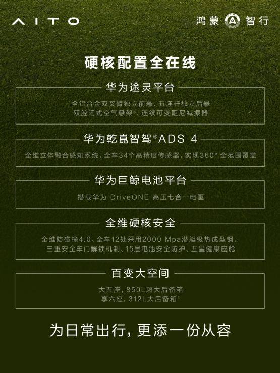 在核心配置方面,全新问界M7增程长续航版延续了在售车型的硬核配置,为用户带来不打折的高端出行体验。车辆搭载途灵平台,集成全铝合金双叉臂独立前悬、五连杆独立后悬、双腔闭式空气悬架、连续可变阻尼减振器等,在保证驾乘舒适性的同时,也赋予了车辆出色的驾控质感。辅助驾驶层面,搭载华为乾崑智驾ADS 4辅助驾驶系统,配备34个感知硬件,实现了对动静态目标(含异形物体)的全场景、全天候精准感知,不仅提升了雨雾尘等恶劣天气下的行车安全性,更能有效识别后向悬浮物及负向场景,构建起360度无死角的安全防护网。三电系统基于华为巨鲸电池平台打造,搭载华为DriveONE高压七合一电驱系统,兼顾高效与可靠;全维防碰撞系统CAS 4.0的加持,则是进一步提升了行车安全系数,为用户驾乘全程保驾护航。