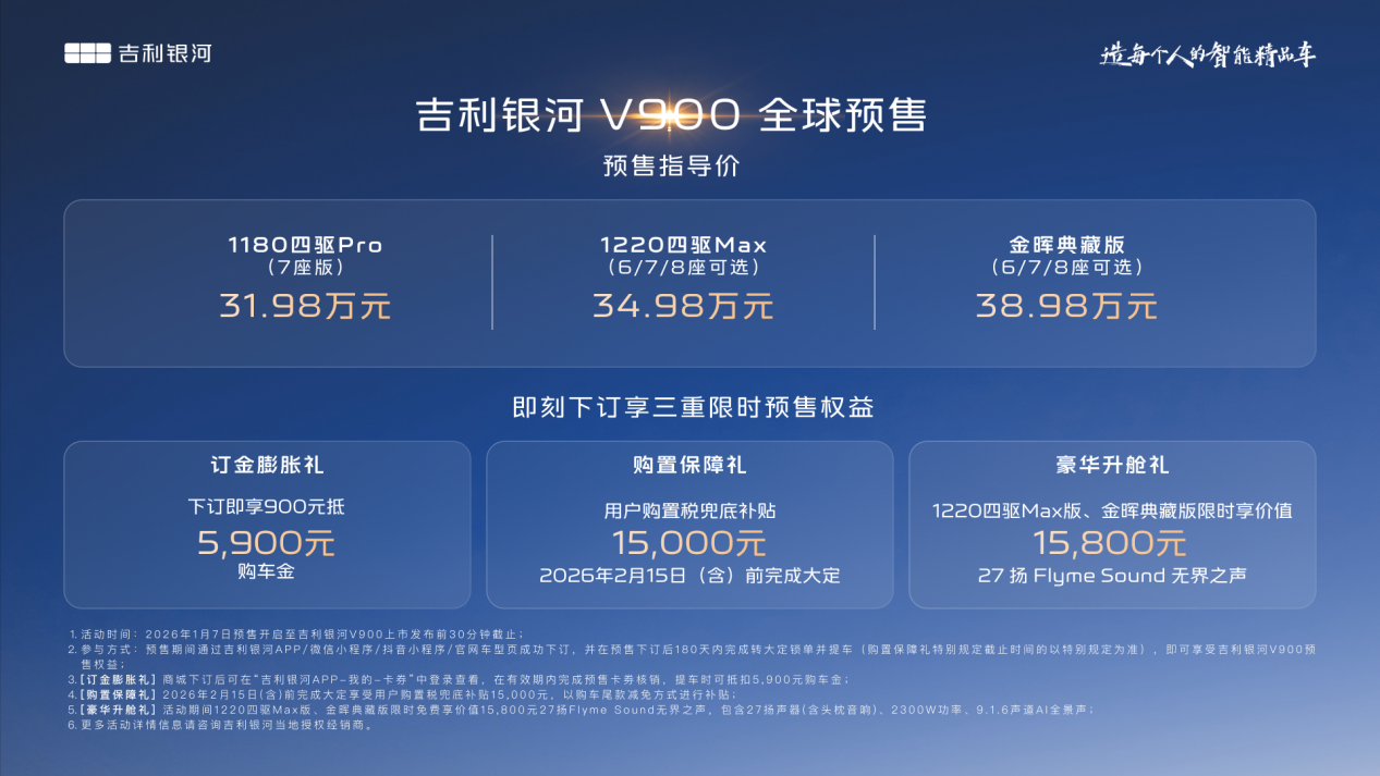 预售价31.98万-38.98万元,配合购置税减免、地方补贴等政策,实际购车成本进一步降低。当同级竞品还在40万以上区间时,银河V900以“高质优价”的理念,确实有实力重构豪华MPV的市场格局。