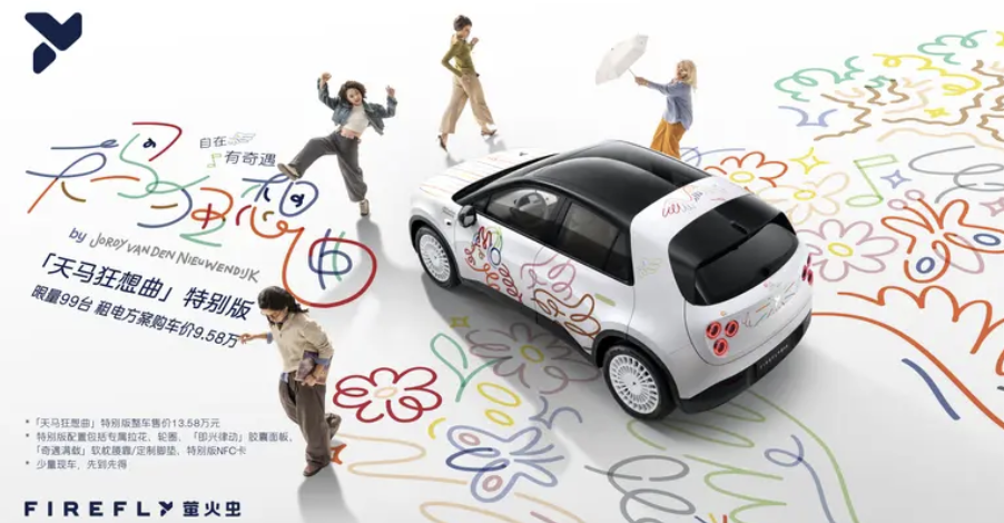 此次天马狂想曲特别版车型的推出以“治愈系艺术”破局,依靠与艺术家联名提升收藏价值,与此前上市的暗夜出行版车型形成差异化布局,二者以百元级价差精准覆盖细分需求,同时也为萤火虫品牌构建个性化标签奠定基础。