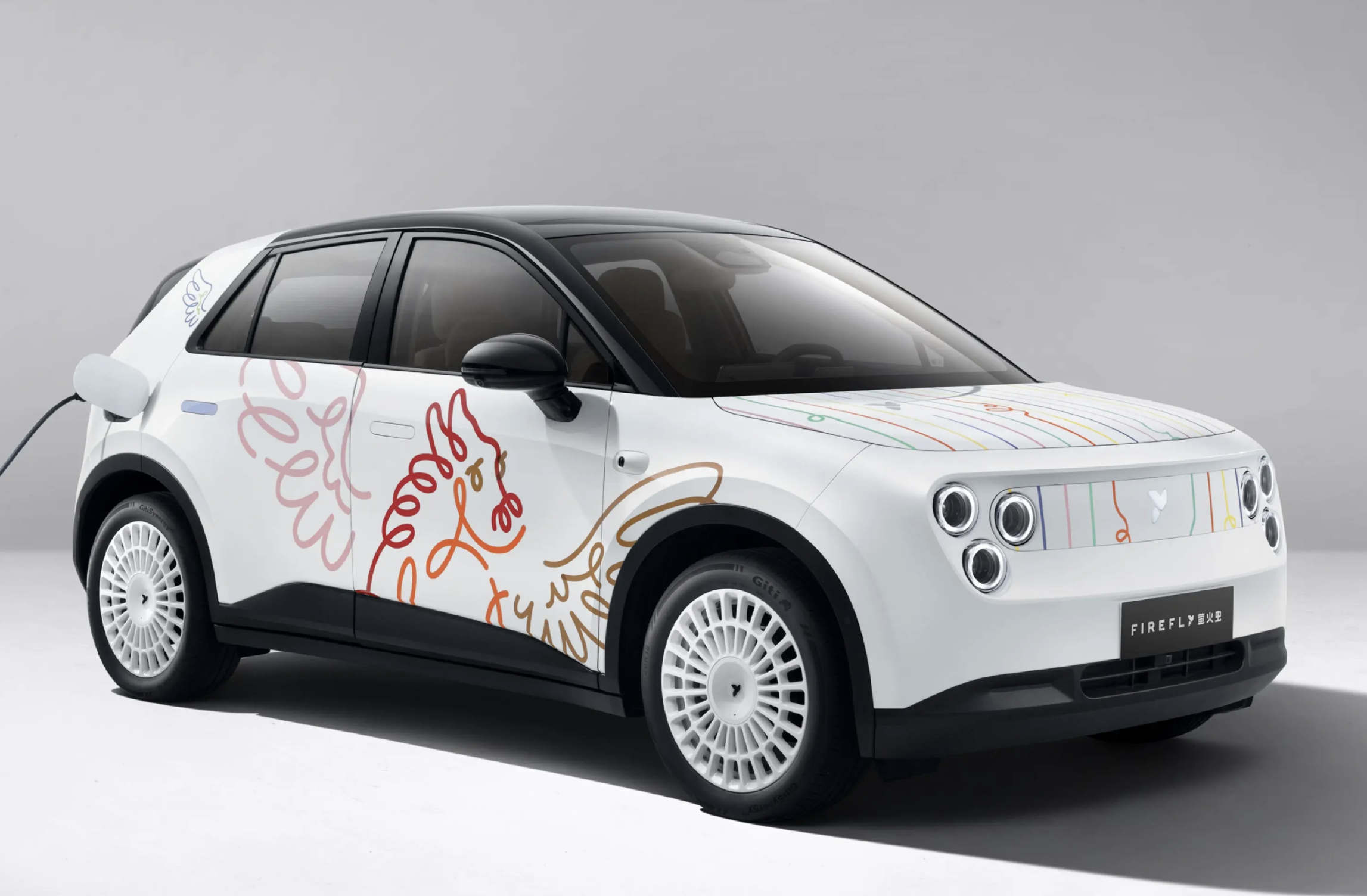 首先来看新车外观,实际上天马狂想曲特别版车型延续普通款车型的整体设计,将纯白色的车身视为“画布”,手绘风格的多彩线条勾勒出带翼天马、蜗牛等春日元素,车尾礼花图案与白色拉力风格轮毂强化其灵动氛围,尤其是艺术家Jordy van den Nieuwendijk的亲笔签名,更是为新车带来收藏属性。
