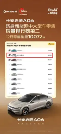 当2025年12月新能源市场还在为价格战激烈博弈时,长安启源A06以10072辆的零售成绩强势跻身新能源中大型车销量榜第二,用破万销量印证了一个朴素的市场真理:在产品同质化严重的当下,真正的决胜密码永远是无可替代的产品力。而这款定价10.99-14.99万元的“大美舒享新家轿”,正是凭借越级配置与精准定位,成为50万长安启源车主大家庭中的又一爆款标杆。