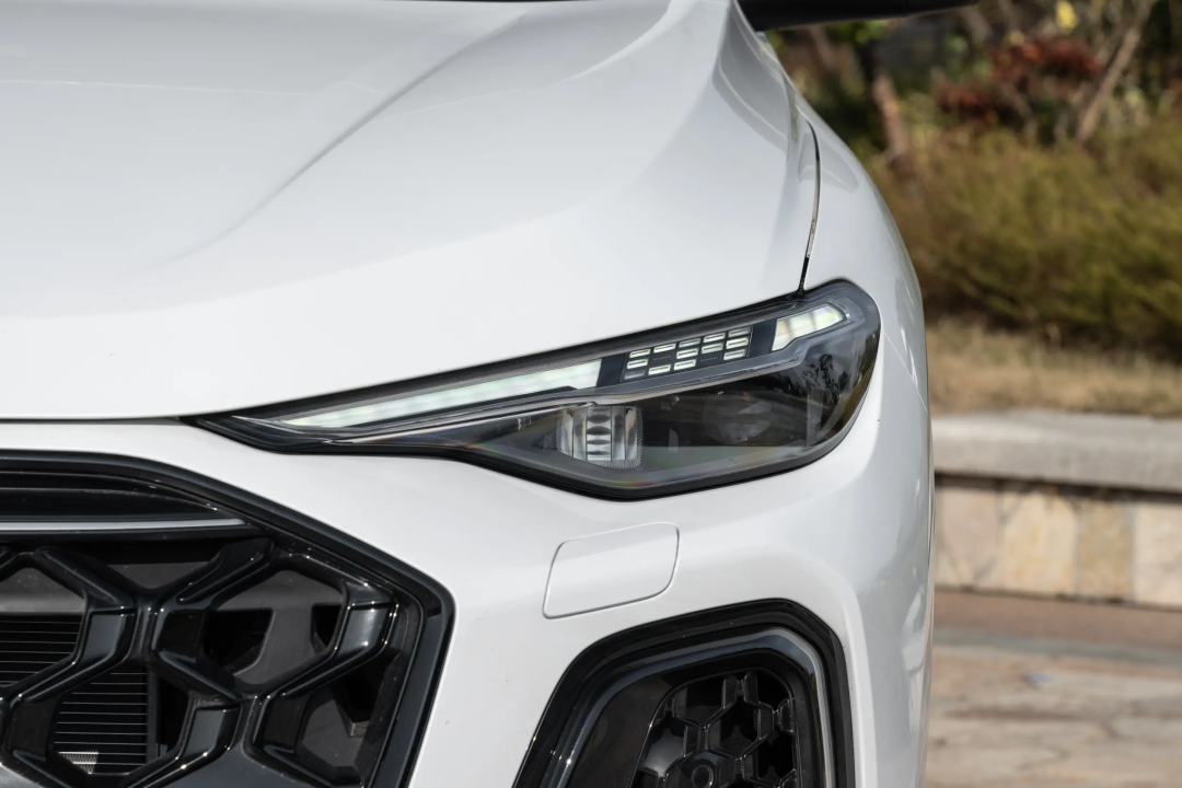 家族式多边形“大嘴”格栅还在,但做了黑化处理,配上可发光的四环Logo、更大的侧进气口和更狭长的头灯,整车看起来明显更低趴、更运动。